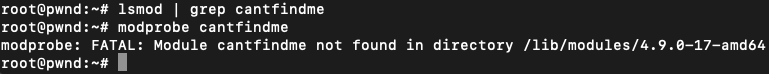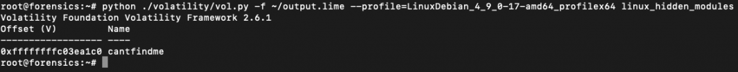 For this example I’ve used HiddenWall to generate a hidden Linux Kernel Module (LKM), named it ‘cantfindme’, and loaded it onto another Debian 9 Linode with the same kernel build/version as the ‘forensics’ machine. Although the module is loaded, it can’t be seen when lsmod or modprobe is executed on the system: