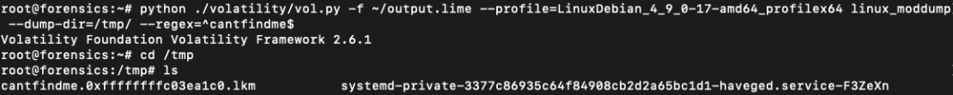 This plugin can help you find hidden Linux Kernel Modules that may be malicious. Even when these modules can’t be seen when you run lsmod on the system, they can both be detected and extracted from a memory dump. You can use the linux_moddump plugin to dump the kernel modules either by specifying their name in a regex pattern or by specifying the base address of the module in the memory image: