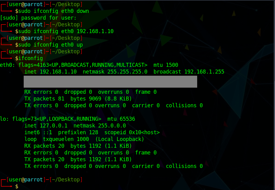 When you run the ifconfig command, it gives you the network interfaces that are attached to your computer, in this case the virtual machine. Since “lo” is the loopback address, we will need to configure eth0’s IP address as ‘192.168.1.10’.