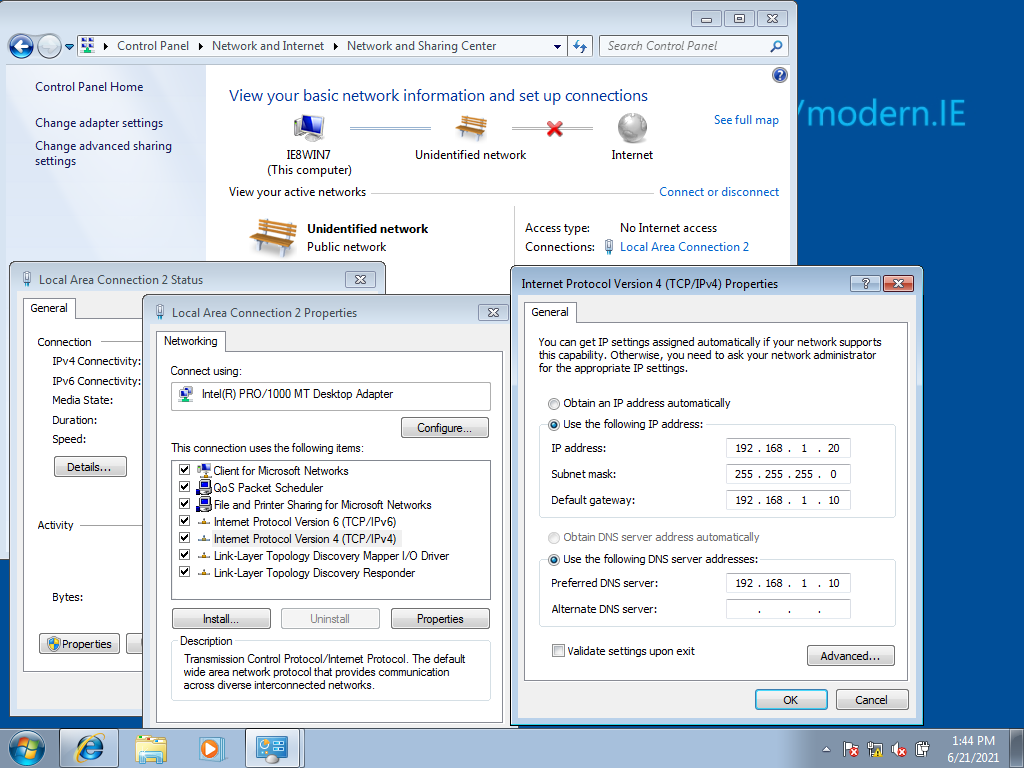 After bringing the interface down, changing the IP and bringing it back up, you should see that the IP address of the interface has changed. Now let’s configure the Windows machine. By now it should be on Host-Only Adapter mode. You can configure the Windows machine’s IP as 192.168.1.20 and the default gateway as shown below.
