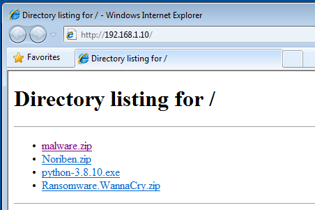 Now, since we’ve setup the Linux server’s IP as 192.168.1.10, this python command will run a basic http server on that IP. You need to open a browser on the Windows machine and go to 192.168.1.10 as shown below.